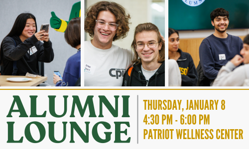 Graduates from the classes of 2021-2025 are invited to join us for the annual Alumni Lounge event on Thursday, January 8, from 4:30 PM to 6:00 PM in the Patriot Wellness Center (PWC). Enjoy pizza, refreshments, and opportunities to win alumni gear while reconnecting with your fellow Patriots! Click here to register.