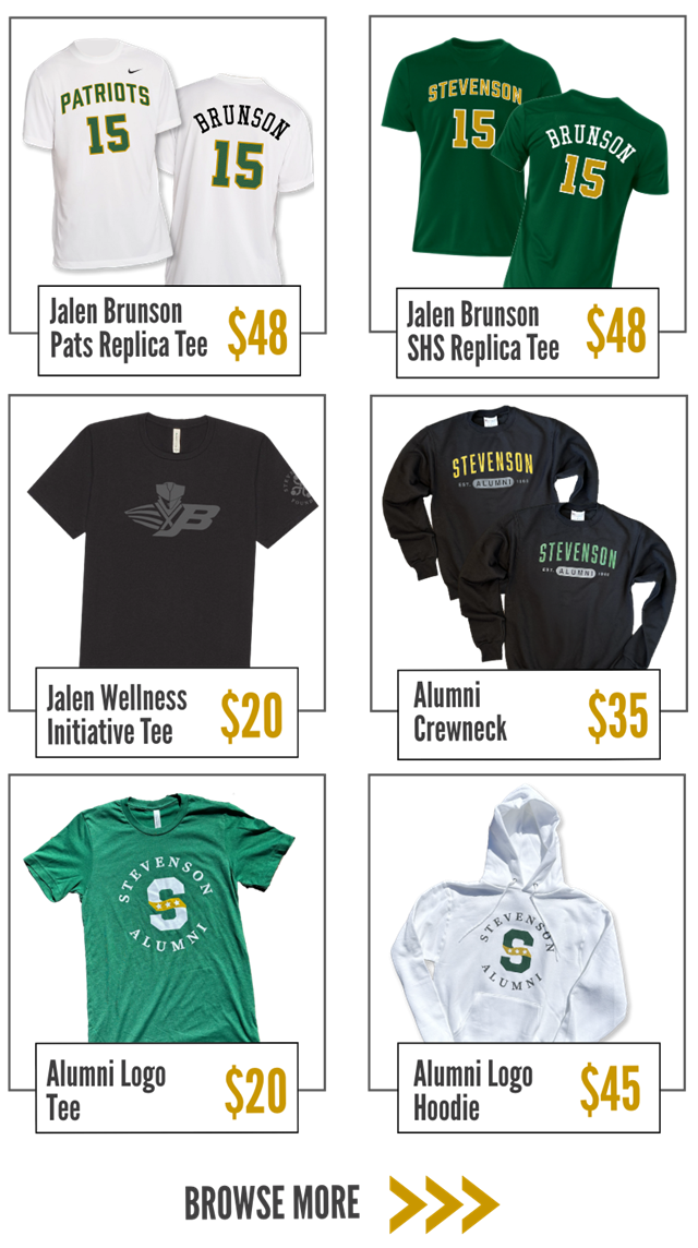Support Stevenson Foundation programs by shopping our merch collection -- including new Jalen Brunson-branded gear and fresh alumni swag! Proceeds from every purchase help ensure all students can succeed at SHS and beyond. |